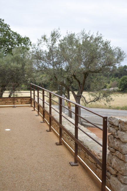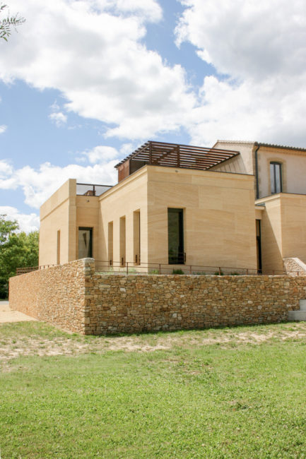 Le soubassement en pierres sèches permet la liaison avec l’environnement et rappelle les murs des bâtisses locales et les murs de clapas.