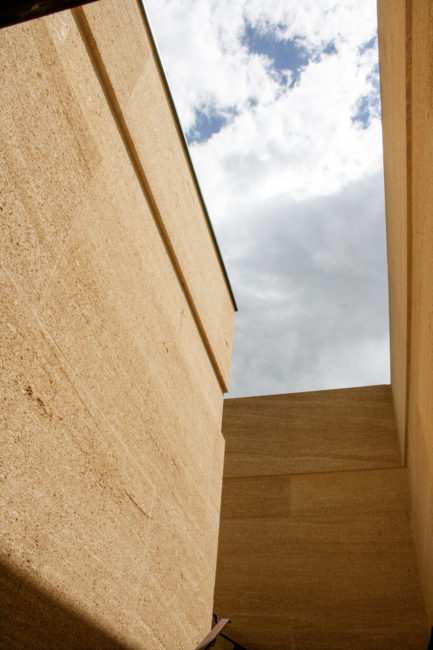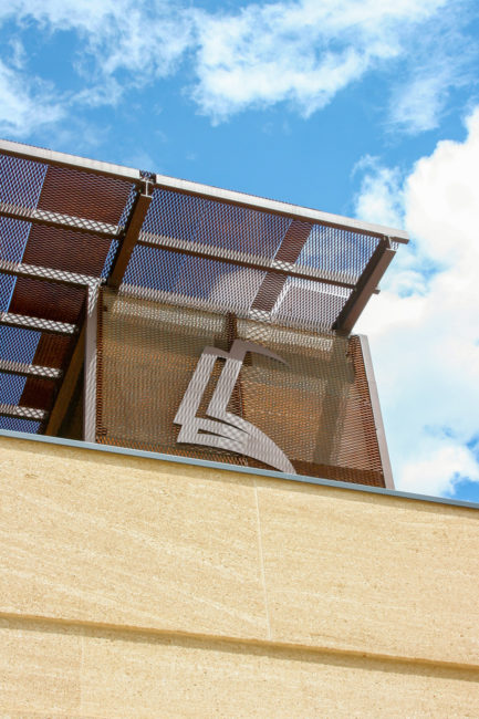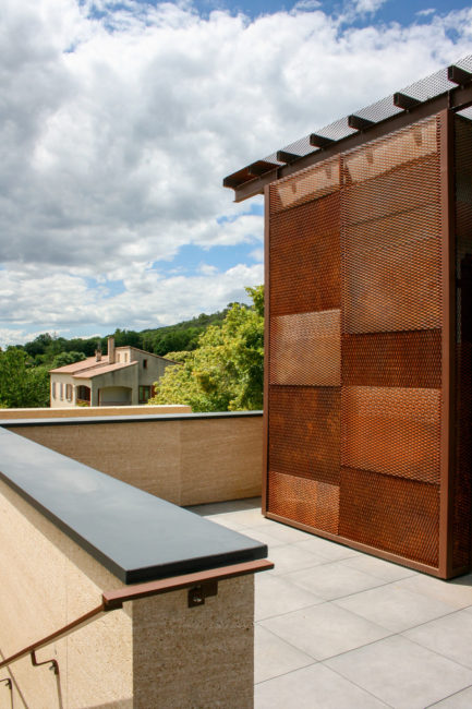 La pierre de Vers est rehaussée par de l’acier corten qui vient habiller l’ascenseur et la pergola de la terrasse en étage, destinée à recevoir des ateliers de lecture avec les enfants de l’école se trouvant à proximité.