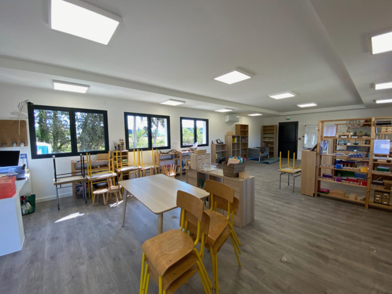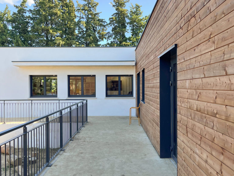 La première extension réalisée vient en complément des trois salles de classes existantes et devenues insuffisantes au vu de l’engouement des parents pour cette école et son enseignement. Nous avons réalisé en très peu de temps une conception et diriger un chantier en trois mois pour assurer la rentrée de septembre 2021. Du point de vue architectural nous avons respecté les caractéristiques du bâtiment existant pour suivre une cohérence avec l’existant.
