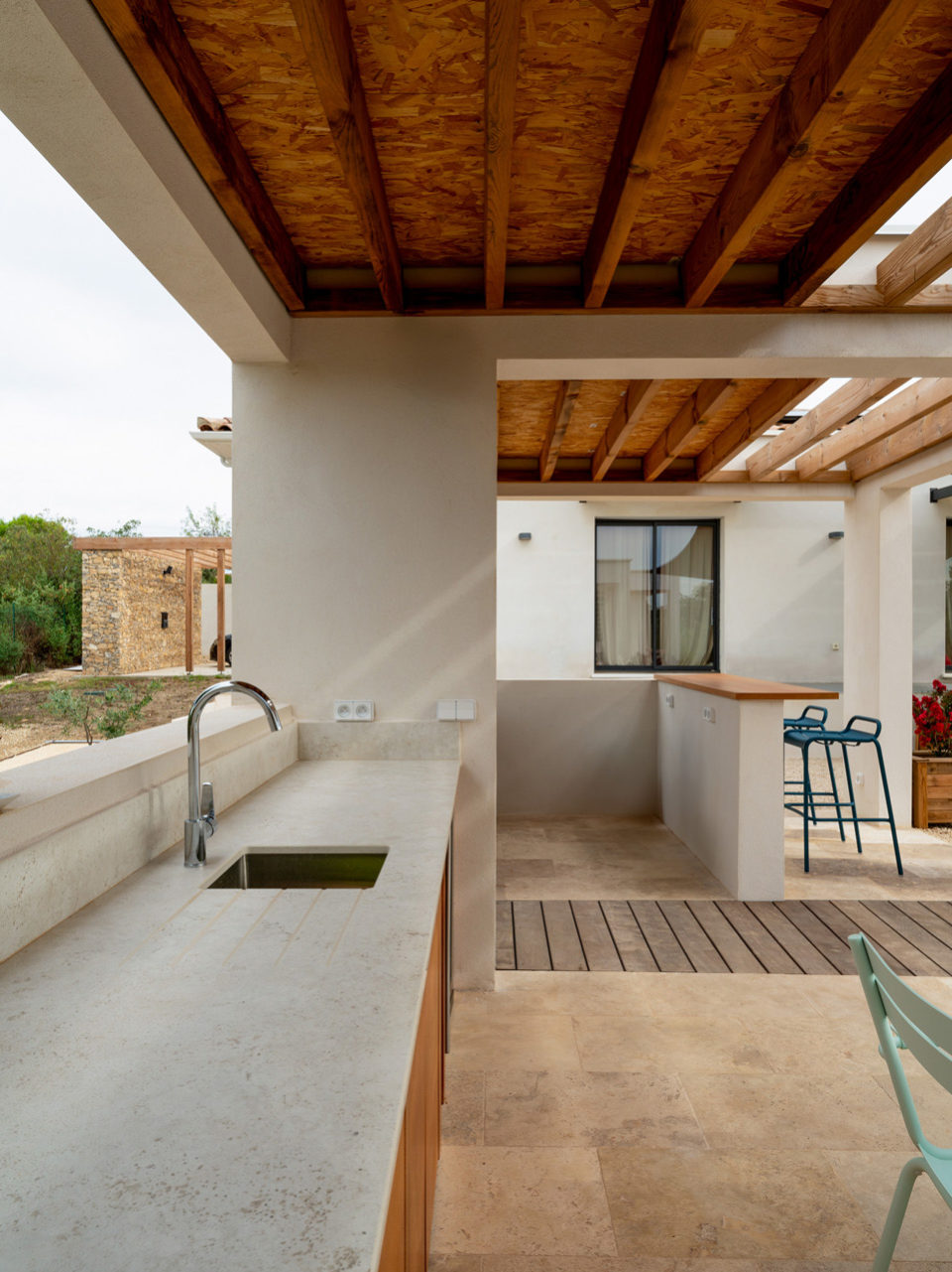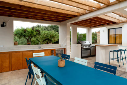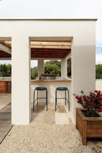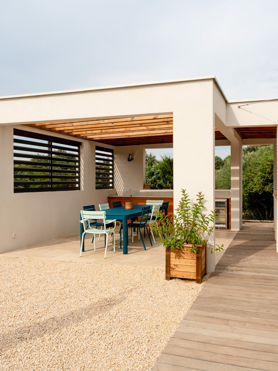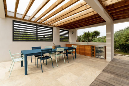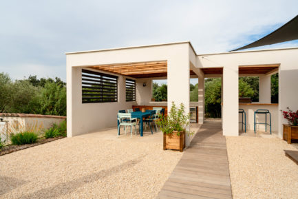En contre-bas, on découvre la cuisine d’été : un bel espace de salle à manger et de cuisine, ainsi qu’un coin barbecue et bar. Un espace de repas ombragé grâce à une toiture terrasse en bois pour couvrir l’ensemble, créant une liaison entre chaque espace.