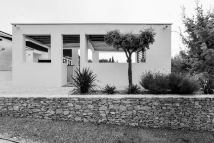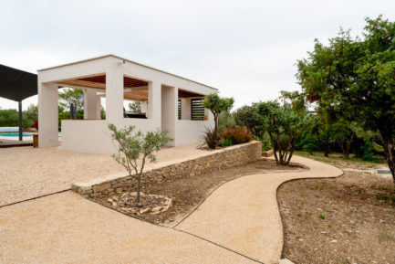 Un carport est créé en ossature bois pouvant accueillir deux véhicules. Son fond est habillé avec un doublage en pierres afin de coller avec l’esthétique des murs de garrigues présents dans ce quartier et à Nîmes plus largement. Ce fond permet de cacher des éléments techniques et de cacher les containers de déchets.